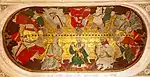 Each of the seven sub-units of the hall is accompanied by a niche-like chamber of equal width behind it (on its eastern side). The three larger chambers are each covered with a rounded vault ceiling made of wooden planks. The surface of the ceiling is covered with leather that has been painted with pictorial scenes. Pictorial scenes are relatively rare in Islamic art (with the exception of miniatures) and scholars generally agree, based on their Gothic-like style, that these paintings were probably executed by Christian artists from a Spanish court (probably the court of Pedro of Castile in Seville).[65][66][67] Another theory by art historian Jerrilynn Dodds is that they were executed by Muslims who were kept as captives in the court of Pedro and thus became familiar with Christian paintings but not deeply rooted in those traditions, resulting in a mix-and-match of Christian Romantic motifs in the same scenes.[68][69] The painting in the middle chamber shows a group of 10 Nasrid officials and dignitaries, including the sultan, sitting on cushions and engaged in a discussion or debate. This scene, because it shows the ruler or "king", inspired the hall's current name. The paintings in the other two chambers show scenes of court life, including a jousting competition and hunting scenes, set amidst a landscape of gardens and palaces.[65][67]