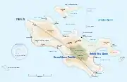 A plateau covered with indigenous woodland extends over most of the island, which is almost encircled by a long sandy beach. The southern coast is rocky. A 69 m (226 ft) hill occupies the centre of the island's southern half. There is an area of mangroves and three small, freshwater swamps.[3] A marine reserve, protecting coral reefs, extends 400 m (1,300 ft) into the sea from the shoreline.[2]