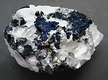 Covellite (also known as covelline) is a rare copper sulfide mineral with the formula CuS.[4] This indigo blue mineral is commonly a secondary mineral in limited abundance and although it is not an important ore of copper itself, it is well known to mineral collectors.[4]
