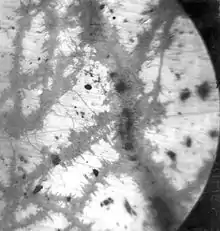 Covellite's unique crystal structure is related to its complex oxidative formation conditions, as seen when attempting to synthesize covellite.[12][13] Its formation also depends on the state and history of the associated sulfides it was derived from. Experimental evidence shows ammonium metavanadate (NH4VO3) to be a potentially important catalyst for covellite's solid state transformation from other copper sulfides.[13] Researchers discovered that covellite can also be produced in the lab under anaerobic conditions by sulfate reducing bacteria at a variety of temperatures.[14] However, further research remains, because although the abundance of covellite may be high, the growth of its crystal size is actually inhibited by physical constraints of the bacteria.[14] It has been experimentally demonstrated that the presence of ammonium vanadates is important in the solid state transformation of other copper sulfides to covellite crystals.[12]