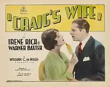 Craig's Wife is a 1928 American silent drama film directed by William C. deMille and starring Irene Rich, Warner Baxter and Virginia Bradford. It was based on the 1925 play Craig's Wife by George Kelly. Subsequent film adaptations followed in 1936 as Craig's Wife and 1950 as Harriet Craig.[1] It is now considered a lost film.