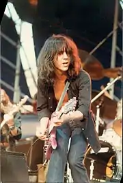 Chaquico's first guitar was a Winston acoustic which his mother bought for him when he was 10 years old after he'd given up his parents' idea that he would play an accordion.[23] He soon branched out to electric, playing several different makes including a Gibson Les Paul Custom that his father bought for him as a gift following his recovery from injuries resulting from a car crash when he and his father were hit by a drunk driver. Chaquico used this guitar while performing with the band, Steelwind, when he was still in high school. With money earned during his first tour with Jefferson Starship in 1973, Chaquico purchased a rare '57 Les Paul Goldtop (only 17 are known to exist that were made without a maple tops and an all-mahogany bodies), which he played through blonde Fender Bassman amps on the first two Jefferson Starship albums and tours, Dragon Fly (1974) and Red Octopus (1975), on such songs as "Miracles".[7][24][25] He also soon added a rare '59 Les Paul Sunburst to his collection which he played on the next two albums, Spitfire (1976) and Earth (1978) and can be heard on such songs as "With Your Love", "Count on Me", and "Runaway".[25][26][27] Both Les Paul Guitars and the Bassman amps, along with several other valuable guitars, were stolen and/or destroyed in a riot in Lorelei, Germany, in 1978, when Grace Slick was unable to perform and the show was cancelled.[28][29][30] Preferring to not take such irreplaceable guitars on the road again, Chaquico moved to Fender Stratocaster, a Guild 12-string, Martin, Dean and B.C. Rich guitars while beginning to work on designs with Mark Kiesel at Carvin Guitars. Into the '80s, Chaquico was sponsored by Carvin Guitars and often appeared on tour, in the studio and in guitar magazine ads playing a Carvin V220 or a Carvin koa doubleneck played through Carvin amplifiers, his favorite being the Carvin X100B.[31]