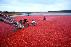 Cranberries are harvested in the fall when the fruit takes on its distinctive deep red color, and most ideally after the first frost.[18] Berries that receive sun turn a deep red when fully ripe, while those that do not fully mature are a pale pink or white color. This is usually in September through the first part of November. To harvest cranberries, the beds are flooded with six to eight inches (15 to 20 centimeters) of water above the vines. A harvester is driven through the beds to remove the fruit from the vines. For the past 50 years, water reel type harvesters have been used. Harvested cranberries float in the water and can be corralled into a corner of the bed and conveyed or pumped from the bed. From the farm, cranberries are taken to receiving stations where they are cleaned, sorted, and stored prior to packaging or processing. While cranberries are harvested when they take on their deep red color, they can also be harvested beforehand when they are still white, which is how white cranberry juice is made.[19] Yields are lower on beds harvested early and the early flooding tends to damage vines, but not severely. Vines can also be trained through dry picking to help avoid damage in subsequent harvests.[20]