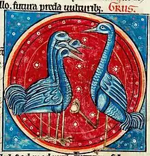 Aristotle describes the migration of cranes in the History of Animals,[21] adding an account of their fights with Pygmies as they wintered near the source of the Nile. He describes as untruthful an account that the crane carries a touchstone inside it that can be used to test for gold when vomited up. (This second story is not altogether implausible, as cranes might ingest appropriate gizzard stones in one locality and regurgitate them in a region where such stone is otherwise scarce.)