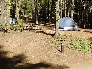 A reservation is required to stay at Crane Flat.[1] Crane Flat is one of the more crowded campsites outside the Valley, but it is a little less noisy than those in the Valley. There are a total of 271 campsites in 5 different driving loops to choose from. The terrain of Crane Flat is very similar to campgrounds in the Valley though it is higher in elevation and not as flat. Trees surround and tower over the campsites making way for very shady campsite environments.