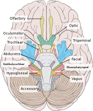 The midbrain of the brainstem has the nuclei of the oculomotor nerve (III) and trochlear nerve (IV); the pons has the nuclei of the trigeminal nerve (V), abducens nerve (VI), facial nerve (VII) and vestibulocochlear nerve (VIII); and the medulla has the nuclei of the glossopharyngeal nerve (IX), vagus nerve (X), accessory nerve (XI) and hypoglossal nerve (XII).[10] The olfactory nerve (I) emerges from the olfactory bulb, and depending slightly on division the optic nerve (II) is considered to emerge from the lateral geniculate nuclei.[10]