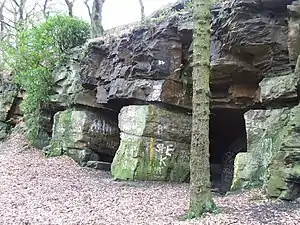 Crank Caverns[1] is the common name of the remains of the Rainford Delph Quarry near Crank in St. Helens, Merseyside, England. It is a network of tunnels and caverns, as well as an extensive woodland.[2] Information in the St. Helens local history archives states that sandstone quarrying began here as early as 1730. As the quarry expanded, the cost of purchasing land to open cast mine it increased, so it was decided to opt for a different method. Instead of quarrying out the stone, they would mine it out, following a seam of stone until it ran out. This resulted in the network of caves, tunnels and shafts we see today. Rainford Delph is listed as a Colliery by 1854, under the ownership of Charles Howarth or Yorkshire Charlie as he was known locally by 1880.[3] Mining finally ceased and the woods and caverns were used as a game reserve by the Earl of Derby until 1939, when they became a storage facility for ammunition for the anti-aircraft position at Crank. After the war, the caverns ceased use as a game reserve. Today, Crank Caverns are not officially open to the public[1]and due to their increasing instability, attempts have been made to close access to the caverns and tunnels themselves. Despite this, the site is still physically accessible from a nearby public footpath and is still a draw for generations of curious locals who wish to explore, many having heard the numerous local myths and legends from an early age.[4]