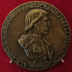 The second signed medal from Cristoforo di Geremia shows Alfonso V of Aragon, King of Naples. It features Alfonso V's bust and was probably inspired by Pisanello's work on Alfonso V. The back of the medal shows Alfonso enthroned and crowned by Bellona and Mars.[1]