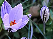Crocus corsicus is a cormous perennial growing to 8–10 cm (3.1–3.9 in) tall. The corm is tear-drop shaped with fine-reticulate, fibrous tunics.[3] One or two, pale to bright reddish violet interior colored slender, fragrant, flowers are produced per blooming corm; the outer surfaces of the tepals are buff with dark purple feathering.[3][4][5][6] The stigma is bright orange-red. The flowering period is from January to April.[3] 2n = 18.[7]