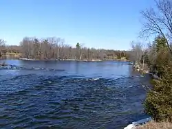 There, the Crowe River passes over Marmora Dam,[2] heads southwest into the township of Stirling-Rawdon, passes over two one-metre (3 ft 3 in)-high and 40-to-60-metre (131 to 197 ft)-wide falls at Callaghan's Rapids Conservation Area,[4] enters the municipality of Trent Hills in Northumberland County, flows over Allan Mills dam,[2] passes over several falls at Crow Bridge Conservation Area,[5] and reaches its mouth at Crowe Bay on the Trent River, just upstream of the Trent–Severn Waterway Crowe Bay lock and dam. The Trent River flows to the Bay of Quinte on Lake Ontario at Trenton.[6]