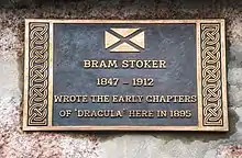 Bram Stoker was a regular visitor between 1893 and 1910. Because he was a part-time writer, his Cruden Bay holidays provided him with the largest amount of spare time to write his books. He stayed at the Kilmarnock Arms Hotel in 1893 and 1894, and thereafter in cottages in Cruden Bay and Whinnyfold. The early chapters of Dracula were written in Cruden Bay, and possibly most of the rest of it was too. He also set two novels in and around the village, The Watter's Mou' (1895) and The Mystery of the Sea (1902).[5]