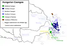 | Romanian (most ethnic Csángós are monolingual Romanian speakers)[6] and Csángó, an old dialect of Hungarian[7][8] | |