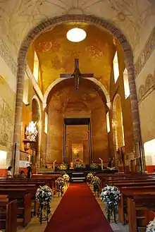 On the west side of the complex, on the south side of both the Cathedral itself and its attached cloister is the capilla abierta (open chapel). This was one of the first constructions of the Spanish built after Hernán Cortés choose Cuernavaca as a seat over his dominions. The chapel was originally bigger than what remains today. The open chapel here was used not only for Mass, but also for plays, music dance and other events designed to explain and reinforce the faith.[9] The roof of the open chapel is supported by large arches and serves as a portico to the cloister. The cloister today is used as office for the bishopric. It was restored to its former look in the 20th century, with two levels surrounding a central courtyard. The levels have corridors marked off by arches.[6] This cloister retains a number of frescos, some of which depict New Spain missionaries in the Philippines and Japan.[3] The main church has a plain facade with the only element with ornate decoration is the bell tower with also contains a clock.[5] Just inside the main portal, there is a bronze statue of Jesus carrying a cross, a lamb and a book. Just beyond this is a very large stone baptismal font.[6] Inside, the decoration is stark and mostly modern, especially in the main altar area. An equilateral cross with an image of Christ is suspended over the altar area and there are small modern crosses and other elements on the side walls. However, the most important decorative element is an 18th-century narrative mural. This mural was uncovered during the renovation work in the mid 20th century. The mural covers 400 m² of both side walls of the main nave of the church and tells the story of the arrival and martyrdom of Philip of Jesus and other missionaries in Japan.[5][10] The mural was probably painted in the middle of the 17th century after the Franciscan missionaries were beatified in 1627. The mural was painted al fresco in a primitive style. Little is known about who painted it or the socio-political context behind its creation. One scholar by the name of Luis Islas Garcia, believes that the artist was a native of Asia who resided in the monastery, assisted by local indigenous people. However, Father Diego Yuki of a museum dedicated to the martyrs in Nagasaki believes that the mural as a purely local work. Phillip of Jesus was beatified in 1627, and canonized in 1629. As the first Mexican saint, as well as a Franciscan, his story would have importance at this establishment. He would have relevance through the colonial period as a symbol of Criollo identity in Mexico. However, this mural was covered over in the 19th century and its existence was forgotten. The work was rediscovered in the 20th century by architect Ricardo Robina when the cathedral was remodeled.[10]