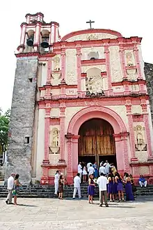 The next most important chapel in the complex is the Tercera Orden Chapel (Capilla de la Tercera Orden), built the northwest corner of the complex in 1722 by Enrique de Jeres, a Franciscan friar. It would later have a seminary installed in one of its annexes by the first bishop of Cuernavaca, which would become one of the most important educational institutions in the city in the 19th century.[5] This chapel was constructed in a style called popular Baroque along with Churriguersque. The facade has sculptures of angels and saints, some with indigenous headdresses. The bell tower has two levels but it is not tall. The portal on the south side is topped with a seashell formation.[7] Inside, it has a Latin cross layout with one name, divided into an upper choir, nave and apse.[5] The main altar is Baroque, profusely decorated with colorful flowers, angel and saints. This altar was constructed by indigenous craftsmen.[7]