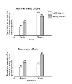 Gerbner's initial work looked specifically at the effects of television violence on American audiences.[21] Measuring the effect of violence underscored the larger part of Gerbner's work on cultivation theory. Therefore, he measured dramatic violence, defined as "the overt expression or threat of physical force as part of the plot."[16] Gerbner's research also focused on the interpretation by high-use viewers of the prevalence of crime on television versus reality. He argues that, since a high percentage of programs include violent or crime-related content, viewers who spend a lot of time watching are inevitably exposed to high levels of crime and violence.[22]