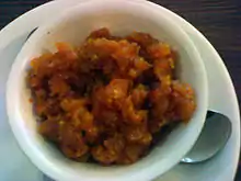 Hyderabadi cuisine, an amalgamation of Persian cuisine, Mughlai, Telugu, Turkish cuisines, developed by the Qutb Shahi dynasty and the Nizams of Hyderabad. It comprises a broad repertoire of rice, wheat and meat dishes and various spices and herbs.[34][35]