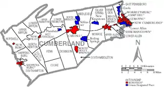 Under Pennsylvania law, there are four types of incorporated municipalities: cities, boroughs, townships, and, in at most two cases, towns. The following boroughs and townships are located in Cumberland County:
