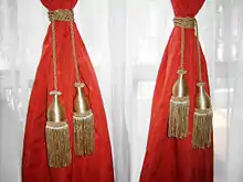 Almost a variety of tassel tie-back, the pendulum tie-back consists of one or two large handing decorative pendulums attached to ropes which loop around the curtain.