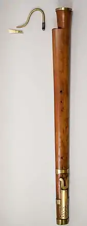 The dulcian is generally made from a single piece of maple, with the bores being drilled and reamed first, and then the outside planed to shape. The reed is attached to the end of a metal bocal, inserted into the top of the small bore. Unlike the bassoon it normally has a flared bell, sometimes made from a separate piece of timber. This bell can sometimes be muted, the mute being either detachable, or built into the instrument. The outside of the instrument can also be covered in leather, like the cornett.