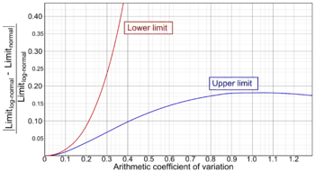 In practice, it can be regarded as necessary to use the establishment methods of a log-normal distribution if the difference ratio becomes more than 0.1, meaning that a (lower or upper) limit estimated from an assumed arithmetically normal distribution would be more than 10% different from the corresponding limit as estimated from a (more accurate) log-normal distribution. As seen in the diagram, a difference ratio of 0.1 is reached for the lower limit at a coefficient of variation of 0.213 (or 21.3%), and for the upper limit at a coefficient of variation at 0.413 (41.3%). The lower limit is more affected by increasing coefficient of variation, and its "critical" coefficient of variation of 0.213 corresponds to a ratio of (upper limit)/(lower limit) of 2.43, so as a rule of thumb, if the upper limit is more than 2.4 times the lower limit when estimated by assuming arithmetically normal distribution, then it should be considered to do the calculations again by log-normal distribution.