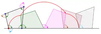 The cyclogon has an interesting property regarding its area.[3] Let A denote the area of the region above the line and below one of the arches, let P denote the area of the rolling polygon, and let C denote the area of the disk that circumscribes the polygon. For every cyclogon generated by a regular polygon,