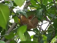 Some authors suggest the silky anteater usually dwells in silk cotton trees (genus Ceiba).[12] Because of its resemblance to the seed pod fibers of these trees, it can use the trees as camouflage[8] and avoid attacks of predators such as hawks and, especially, harpy eagles. During the day, they typically sleep curled up in a ball.[13] Although they are rarely seen in the forest, they can be found more easily when they are foraging on lianas at night.