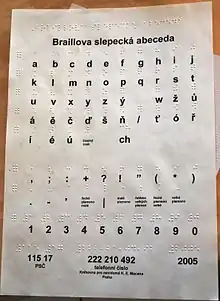 Czech Braille is the braille alphabet of the Czech language. Like braille in other Latin-script languages, Czech Braille assigns the 25 basic Latin letters (not including "W") the same as Louis Braille's original assignments for French.