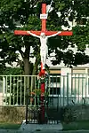 Red cross / Červený kríž | Pri kríži Street, next to the fence of ZŠ Pri Kríži | Built by the village Dúbravka out of gratitude for ground water appearing in this somewhat arid area allowing good harvest. The wooden cross is painted red and contains a sculpture of Jesus Christ. It was reconstructed by the local government office in 1993 and again in 2008.[2] |