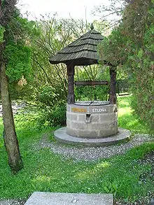 Horánska well / Horánska studňa | K Horánskej studni Street, inside a small park and children's playground | The former main village well from the 16th century used to contain water even in times of drought and it features in the coat of arms of Dúbravka. Surplus water flew into a pond, which fed a small stream. Later, pipeline into the local school was built as well as into the houses of some inhabitants. The above ground portion of the well is made of concrete with the following text engraved: "Horánska studňa / 1574 / 1993". The well, though closed and purely decorative, features a water drawing mechanism under the small roof. It was reconstructed in 1993.[2] |