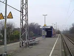 Düsseldorf-Eller Süd station is located approximately 5 kilometres south of Düsseldorf Hauptbahnhof in the district of Eller in the city of Düsseldorf in the German state of North Rhine-Westphalia. It is on the Cologne–Duisburg line and is classified by Deutsche Bahn as a category 5 station.[1] It is served by Rhine-Ruhr S-Bahn lines S 6 every 20 minutes and by a few services of S 68 in the peak hour.