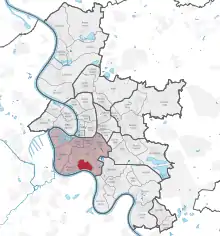 map of Düsseldorf, showing Flehe (in red) within District 3 (in pink)