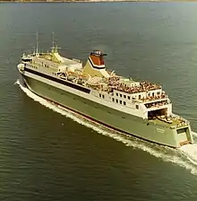 Rail and road vehicles were loaded and unloaded through the stern of the ship via a double linkspan. Passengers without vehicles boarded through a walkway on the starboard side.