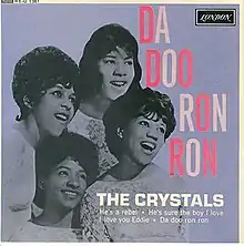 "Da Doo Ron Ron" is a song written by Jeff Barry, Ellie Greenwich and Phil Spector. It first became a popular top five hit single for the American girl group The Crystals in 1963. American teen idol Shaun Cassidy covered the song in 1977 and his version hit number one on the Billboard Hot 100 chart. There have also been many other cover versions of this song, including one by the songwriters Jeff Barry and Ellie Greenwich themselves, performing as The Raindrops.