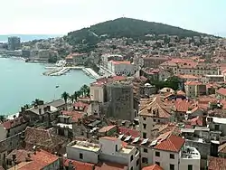 In the Dalmatian city states, there were almost invariably two opposed political factions, each ready to oppose any measure advocated by its antagonist.[7] The origin of this division seems here to have been economic.[7] The farmers and the merchants who traded in the interior naturally favoured Hungary, their most powerful neighbour on land; while the seafaring community looked to Venice as mistress of the Adriatic.[7] In return for protection, the cities often furnished a contingent to the army or navy of their suzerain, and sometimes paid tribute either in money or in kind.[7] The citizens clung to their municipal privileges, which were reaffirmed after the conquest of Dalmatia in 1102–1105 by Coloman of Hungary.[7] Subject to the royal assent they might elect their own chief magistrate, bishop and judges. Their Roman law remained valid.[7] They were even permitted to conclude separate alliances. No alien, not even a Hungarian, could reside in a city where he was unwelcome; and the man who disliked Hungarian dominion could emigrate with all his household and property.[7] In lieu of tribute, the revenue from customs was in some cases shared equally by the king, chief magistrate, bishop and municipality.[7] These rights and the analogous privileges granted by Venice were, however, too frequently infringed, Hungarian garrisons being quartered on unwilling towns, while Venice interfered with trade, with the appointment of bishops, or with the tenure of communal domains. Consequently, the Dalmatians remained loyal only while it suited their interests, and insurrections frequently occurred.[7] Zadar was no exception, and four outbreaks are recorded between 1180 and 1345, although Zadar was treated with special consideration by its Venetian masters, who regarded its possession as essential to their maritime ascendancy.[7]