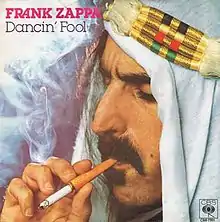 "Dancin' Fool" is a song by Frank Zappa from his 1979 album Sheik Yerbouti. It was the first of two singles released from the album, followed by the second single "Bobby Brown (Goes Down)." The song premiered on stage on the 30th of October 1977 (as can be heard on the Halloween '77 boxset released in 2017).[2] Much like Zoot Allures' closing track "Disco Boy", it mocks the disco culture of the 1970s, but unlike "Disco Boy", the song directly focuses on the dancing aspect of the culture. Specifically, the character Zappa is singing as cannot help but dance, despite how awful he is at it. He refers to his dancing as "social suicide" and says, "The beat goes on and I'm so wrong." He mentions as part of the reason for his bad dancing that, "One of my legs is shorter than the other," a reference to a severe injury Zappa sustained at the Rainbow Theatre in 1971. "Dancin' Fool" charted at 45 on the U.S. charts, making it Zappa's 2nd highest charting single, behind his 1982 song, "Valley Girl". The song was nominated for the Grammy award for "Best Male Vocal", but did not win.[3] It was included on Zappa's best of compilation, Strictly Commercial.[4][5]