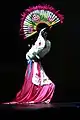 A dancer in a white dangui performing buchaechum (a fan dance)