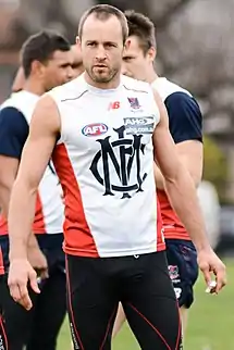 In November 2013, Cross signed with Melbourne as a delisted free agent on a one-year contract.[12] Brought into the club due to his 'reputation for elite preparation and leadership to help out the younger players',[13][14] he was named in the leadership group alongside Lynden Dunn and Chris Dawes in April 2014, replacing the injured Jack Trengove and retired Mitch Clark.[15] He played the first thirteen matches of 2014 before succumbing to a broken leg during the round 14 match against North Melbourne, he played the remainder of the match,[16] but was forced to miss the next five matches through injury. He was offered a contract extension for 2015 in July due to his leadership experience.[17] He returned to the side in round 20 against Hawthorn and played the remaining four matches for the season. He won the Dick Taylor trophy for finishing fifth in the best-and-fairest behind Nathan Jones, Dom Tyson, Bernie Vince and Lynden Dunn,[18] he was also rewarded with the James McDonald award for best team man.[19]