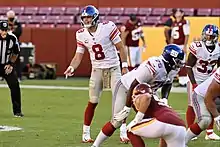 Despite a stellar preseason, Jones was named the backup behind Eli Manning.[17] Jones played his first regular season game on September 8, 2019, against the Dallas Cowboys in relief of Manning, where he completed 3-of-4 passes for 17 yards and lost a fumble as the Giants lost 35–17.[18] On September 17, 2019, Jones was named the starter over Manning for the Week 3 matchup against the Tampa Bay Buccaneers.[19] In his first start, Jones completed 23 out of 36 passes for 336 yards with a 112.7 passer rating and two passing touchdowns along with 28 rushing yards and two rushing touchdowns in a 32–31 comeback win against the Buccaneers despite losing two fumbles.[20] He became the first Giants' rookie quarterback to win his first career start since Scott Brunner in 1980. Jones led the Giants back from an 18-point deficit to beat the Buccaneers and became the seventh rookie quarterback in NFL history since 2010 to have a game-winning drive in their first career start.[21][22] He was also named NFC Offensive Player of the Week for his performance in Week 3.[23]