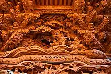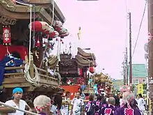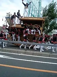 Danjiri are large wooden carts (danjiri guruma) in the shape of a shrine or temple. The carts, often being crafted out of wood, are very ornate, with elaborate carvings. Towns with danjiri festivals in them have different neighborhoods, each with their own guild responsible for maintaining their own danjiri cart. The cart is kept in storage for most of the year. As the festival approaches, the danjiri cart is prepared with elaborate flower arrangements, prayer cards, ornaments, and religious consecrations. They also make a special song every year. It is believed that spirits or gods reside in the danjiri. The person on the roof of the Danjiri cart controls the direction of movement and performs a traditional fan dance.[3]