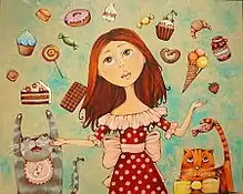 Cats are the most common characters on Daria's scenes. Daria calls it the "Happy Art" movement.[1] She get inspiration from the overseas travelling and from the family circle. Daria started to experiment with techniques of different kinds from the very childhood. She even painted a church in a town of Buddy, Ukraine. Together with her husband Daria visited such countries, as United States, Spain, Cambodia, Thailand, India, Sri Lanka, Montenegro, Serbia, Bosnia and Herzegovina etc. Every journey has inspired Daria to create a brand new collection of painting. All of them are exhibited both in the Ukraine and abroad.