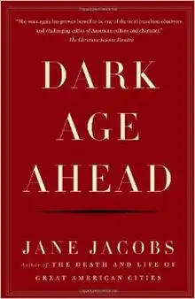 Dark Age Ahead is a 2004 book by Jane Jacobs describing what she sees as the decay of five key "pillars" in "North America": community and family, higher education, science and technology, taxes and government responsiveness to citizen's needs, and self-regulation by the learned professions.[1]: p24