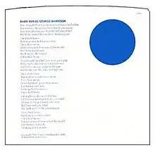 Backed with "I Don't Care Anymore", "Dark Horse" was issued as the album's lead single in America (as Apple 1877), on 18 November 1974.[86][87] It was one of only three tracks from Dark Horse that Harrison performed during the tour.[88][89] The single was available in a white sleeve on which the song lyrics and a large dot appeared in blue print.[77] Capitol Records, Apple's US distributor, sent an edited mix, cutting a minute's worth from the middle of the song, as a promotional disc for radio stations across America.[39]