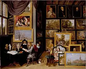 Teniers played an important role in the development of the genre of gallery paintings and his mid-17th-century gallery paintings of the collection of Archduke Leopold Wilhelm are among the most famous examples of the genre.[33][34] The earliest works in this genre depicted art objects together with other items such as scientific instruments or peculiar natural specimens. These paintings expressed the Early Modern culture of curiosity, in which art works and scientific instruments were mixed together in so-called cabinets of curiosities. The persons populating the galleries in these early works are 'virtuosi' who appear as keen to discuss scientific instruments as to admire an artwork. Teniers transformed the genre in the mid 17th century by moving away from the depiction of cabinets of curiosities to depicting art galleries, and in particular the collection of Archduke Leopold Wilhelm. In the final, 'late' phase of the genre from c. 1660 to 1690, artists such as Teniers's pupil Gillis van Tilborgh went further in removing non-art objects from the gallery and introduced figures in the gallery setting who claimed elite status by virtue of their knowledge of (and, as in some cases artists are present, ability to produce) art.[33]