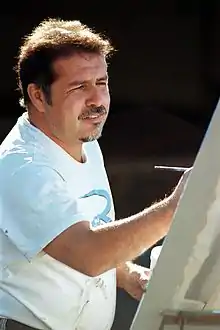 In 2010 the Tucson Museum of Art's ¡Viva David Tineo! retrospective corrected the common misconception of Tineo as primarily a muralist.[8] He's completed over 3,000 paintings over the course of his 38-year career,[15] and his canvases hang on the walls of private collectors, museums, galleries (including a gallery in South Tucson devoted entirely to his work), and political entities from the US and Mexico to Kazakhstan.[16] To honor the quality and extent of his career the Tucson Pima Arts Council presented Tineo with a Lifetime Achievement Award in 2011.[17] Though his blindness required Tineo to quit teaching, it did not stop him from painting. Because he often sees only glare, and cannot make out light, shadow or different shades of color, Tineo has explored numerous techniques for replacing his dependence on vision.[18] He usually lays his canvases on the ground and outlines concepts with caulks and silicon adhesives, achieving more subtle textures with a wet sponge, before applying paints. By creating these textured, raised, 3-D surfaces he can “see” the canvas with his hands and feel it through his brush.[2][19] His more tactile painting style has created an evolution in his conceptual style as well: his artwork is now more symbolic, and the colors more direct, with fewer fine details.[4][8][20]
