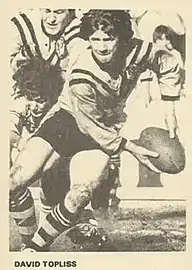 David Topliss (29 December 1949 – 16 June 2008), also known by the nickname of "Toppo", was an English World Cup winning professional rugby league footballer who played in the 1960s, 1970s and 1980s, and coached in the 1980s and 1990s. He played at representative level for Great Britain, England and Yorkshire, at club level for Wakefield Trinity (Heritage № 746) (two spells) (captain), Penrith Panthers (Heritage № 123), Balmain Tigers, Hull F.C. (Heritage №) (captain) and Oldham (Heritage № 903), as a stand-off, i.e. number 6,[1] and coached at club level for Wakefield Trinity.[4]