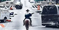 Computer-generated imagery was used in much of "Days Gone Bye", particularly when Rick encounters a legless walker.[39] "The woman was wearing basically blue stockings and then everything was cleaned out. There is an alarming amount of CGI in the pilot episode and in the whole show, and you would never know it," said Robert Kirkman.[39] Kirkman felt that Stargate Studios, which was chosen by producers to edit the pilot episode, did a splendid job. He stated: "There's a shot where Rick is riding off on the horse and his hat actually blew off, and they really liked that shot, and so they had Stargate go in and digitally put the hat back on his head."[39]