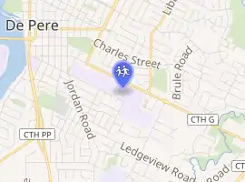 Until 1870, schooling for all grades in De Pere, Wisconsin was held in one building; starting in 1870, a high school was located in a stone building on the corner of James Street and Wisconsin Street.[2] During the back half of the 1890s, plans were made for a new high school at the corner of Chicago Street and Broadway. A fire ravaged the stone school on February 20, 1900; it was demolished in 1906 after sitting dormant.[2] After spending the rest of the term at the local German Benevolent Society Hall, the school located at Chicago and Broadway opened in fall 1900. It was quickly nicknamed the "Castle School" or "Castle on the Hill" due to its architecture and topographic situation.[3] In 1978, the current high school was built at 1700 Chicago Street. It underwent major expansion in 2001, with the addition of a gymnasium and several classrooms. In January 2007, more classrooms were added. In 2017, De Pere High School underwent another small expansion. De Pere High School's mascot is the Redbird.