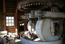 The first paper mill in the Zaan region was built in 1605.[3] De Schoolmeester was built in 1692.[1] It is also known by the nickname De Gauwdief.[4] The name De Schoolmeester (English: The Schoolmaster) probably denotes the occupation of one of the founders. The mill originally made grey paper. In 1778, the mill was powering two Hollander beaters. In 1852, the mill was bought by Gerbrand de Jong, who owned another wind-powered paper mill, De Kaarsenmaker at Zaandijk. He bought another nearby paper mill, De Vergulde Bijenkorf in 1854. In 1871, the mills were owned by Gebroeders de Jong, who demolished De Kaarsenmaker in the autumn of 1873. In 1877, the mill was modernised and a steam engine installed as auxiliary power. This meant that the mill was uninsureable against fire. In 1902, the nearby De Vergulde Bijenkorf burnt down. A steam driven paper factory was erected to replace it. This factory was able to make white paper. A fire started at De Schoolmeester in 1915 but was extinguished.[5] In 1948, the steam engine was replaced by a Ford gas engine. On 1 March 1949, the drying sheds were damaged in a storm, with over 30 metres (98 ft) of them being affected. They were rebuilt shorter than they had been previously.[4] On 28 August 1957, De Schoolmeester was sold to Vereniging van Nederlandsche Papierfabrikanten by the de Jongs.[5] In 1964, the gas engine was replaced by a Bernard diesel engine.[4] In 1977, the mill was bought by Vereniging Zaansche Molens.[3] The diesel engine was replaced by an electric motor in 1979.[4] A four-year restoration of the mill at a cost of €450,000 was completed in June 2002. The work included complete renewal of the drying sheds.[3]