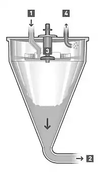 As shown in Figure 3, the product is distributed as a thin layer on a high speed spinning disc [3] via special feed system [1]. The centrifugal force slings it through a perforated screen onto the inner wall of the vessel, which is under vacuum . Air (gas) pockets are released in the process and are drawn off by the vacuum [4]. A discharge pump [2] carries the deaerated product to the next process in the production line. For high viscous products the rotating disc is replaced with static one.