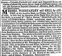 John Henry Tilson (1768-1836) owned Watlington Park in Oxfordshire.[10] He lived there until his death. When he died he left his property including Watlington Park and Dean's Place to his only surviving child Maria Susan Tilson (1822-1868). In 1842 she married Thomas Shaen Carter[11] and the estates came under his ownership. The Tithe Map of 1843 records him as the owner. The couple retained ownership of Dean's Place until 1854 when it was advertised for sale. The advertisement is shown. At that time it was part of a large farming estate of over 700 acres.